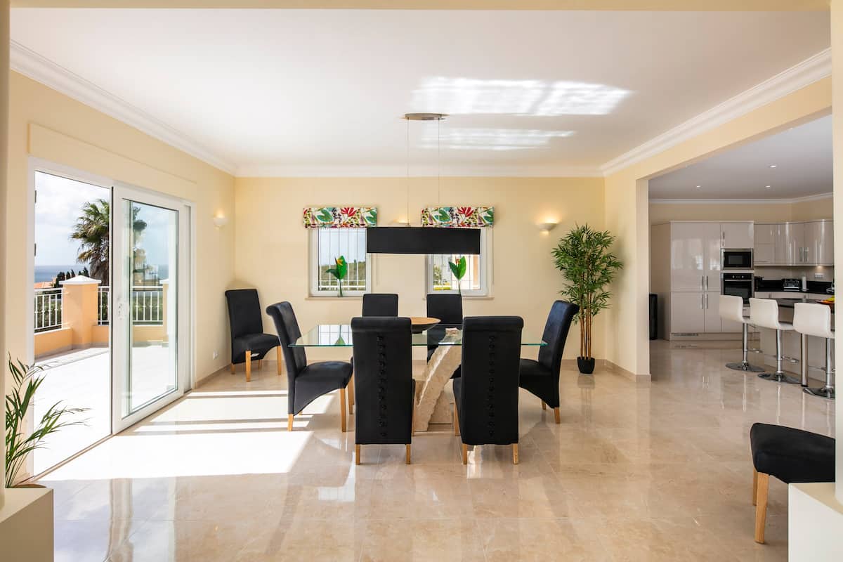 In order to take advantage of the breathtaking views of the ocean and the “Black Rock” of Luz, the main living area is on what is essentially the first floor of the property, which is accessed by private electric gates up the sloping drive way.