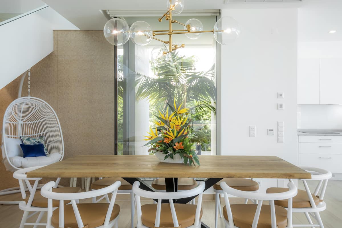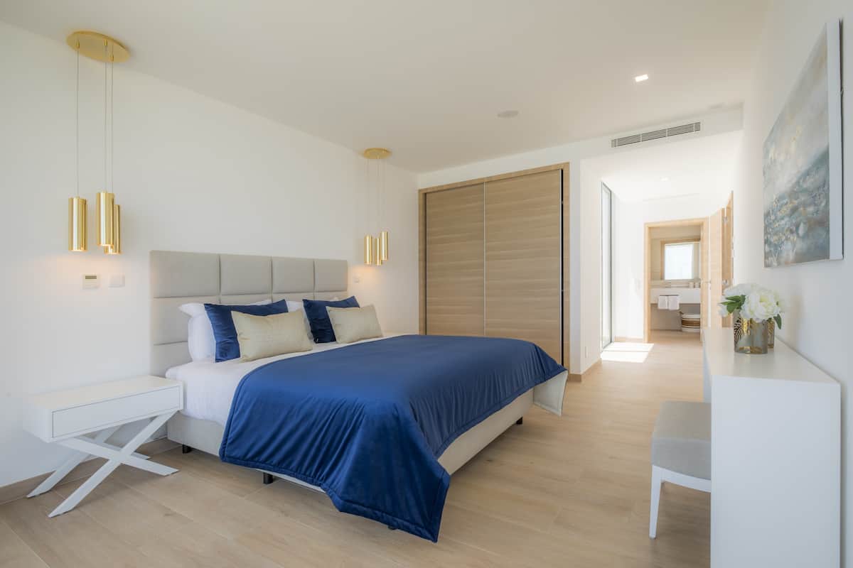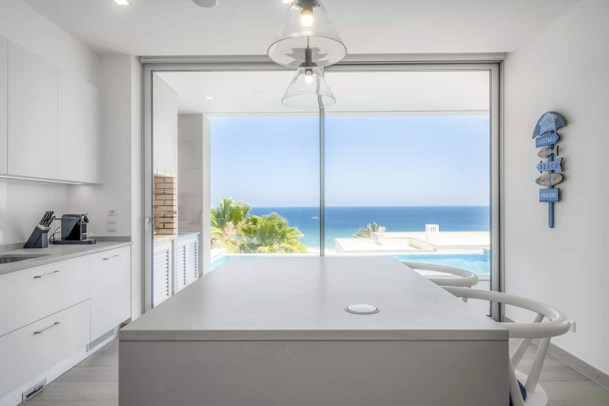 Upon entering the villa you’ll instantly notice the breathtaking view out to sea through the full length sliding doors and this view only gets better as you make your way through the home! The exceptionally designed large and bright open-plan lounge provides a large L-shaped sofa for comfort and a dedicated dining area for 8, or should you wish for some down time there is even a perfect reading cove for quiet moments under the stairway. Finally you’ll find a fully equipped kitchen which has all you will need for a stress-free self-catering experience. All of this is brought together by the exceptional glass wall feature bringing the outside in and making this a truly unique space.