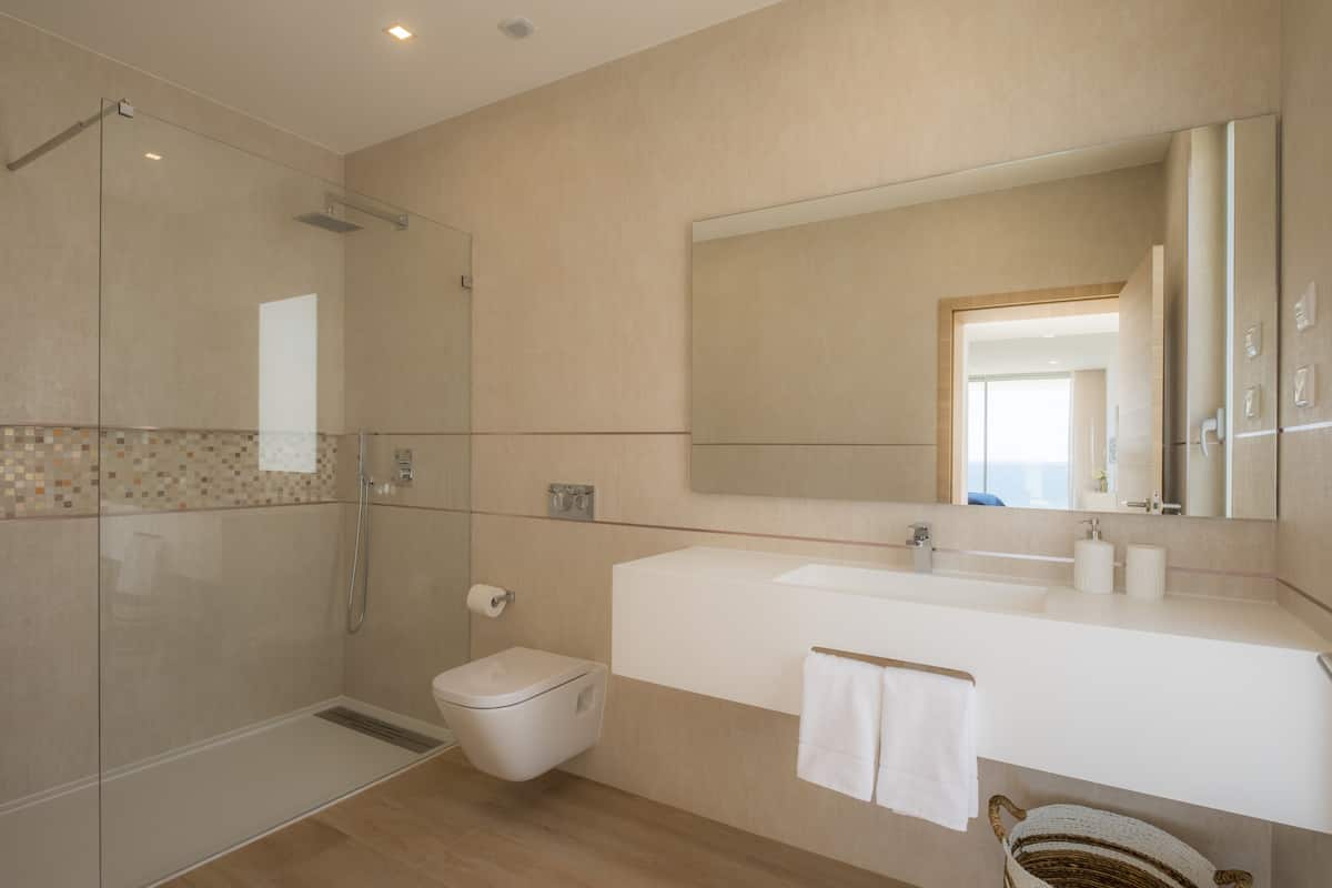 Wake to the most beautiful views out across the Atlantic ocean from either of the bedrooms.This lovely home away from home boasts four tastefully designed and spacious bedrooms all including an en-suite. All are decorated in fresh neutral colours, on the ground floor there is a double bedroom which provides direct access through the sliding doors to the private pool and Jacuzzi as well as being the only bedroom to offer a bathtub as well as shower making an ideal choice for a person with restricted movement. Downstairs is also serviced by a family bathroom. Continuing up the open stairway there is a further double bedroom and two single beds both including fitted wardrobes and a full length over head shower and finally the master bedroom which also benefits from its own private terrace with 2 chairs making the perfect spot for some late night star gazing. All 3 of these bedrooms have access to the upper terrace overlooking the pool area and offering truly amazing views across the ocean.