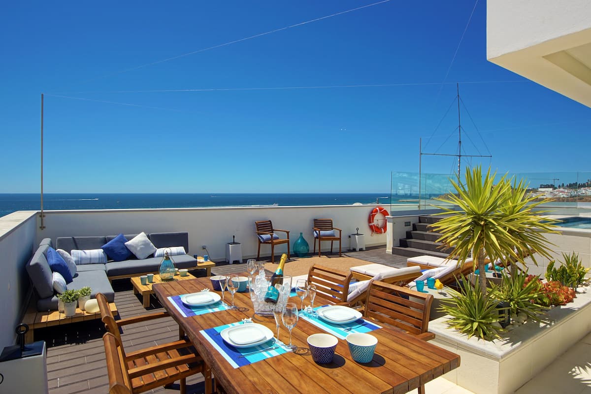 On the roof terrace complete with a pool, heated on request, a dining area and an chill out area, where you can enjoy the sound of the ocean waves.