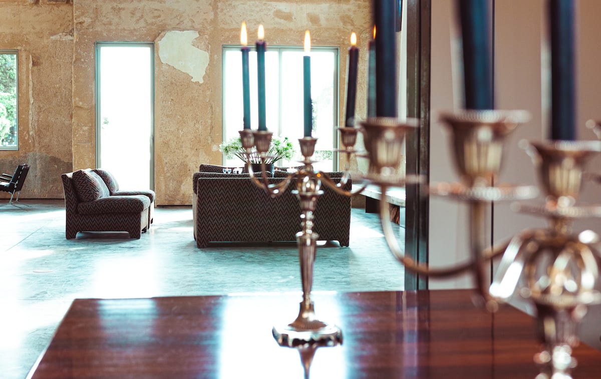 The main living room upon entering the building boasts a double ceiling height, welcoming plenty of natural light, a comfortable sitting area by the fireplace, and an antique long tail piano. There is also a guest bathroom on this floor.
